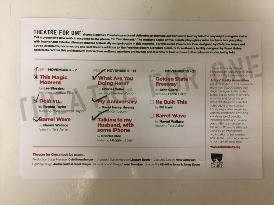 Theatre for One commissioned eight of Signature’s resident playwrights to each write a 10ish-minute new play specifically for this residency. During each week of their three-week residency, Theatre for One performs three of the plays in repertory from 4-7pm Wednesday-Sunday from November 2 through November 21.[1]