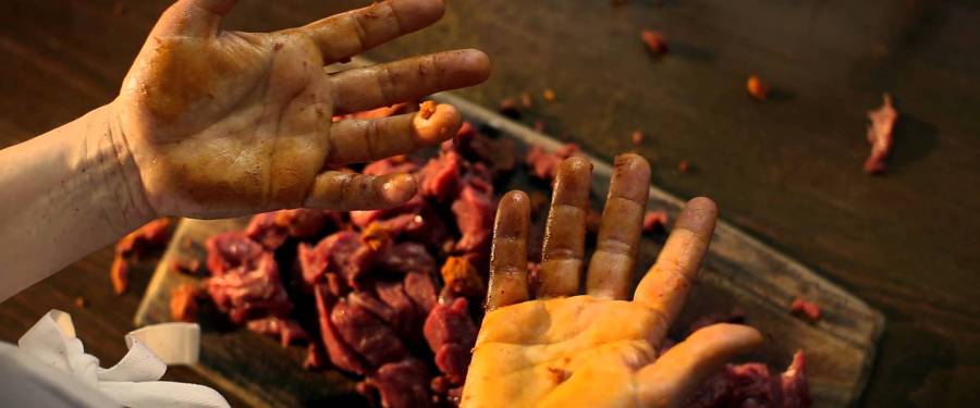 Yet cooking comes with a dark underbelly. Eating can often be a violent act — think of teeth voraciously biting into blood red meat — that almost always involves killing a living animal for our pleasure (even vegans must murder plants for their consumption). On a sociological level, many fans of ethnic cuisine may conflate their familiarity with and affection for exotic dishes with a deep understanding and kinship with their countries of origin. Similarly, frequenters of global theatre — those who seek out art that hopefully facilitates a worldlier perspective — often subsequently consider themselves experts in the foreign affairs depicted (the play’s title – specifically the phrase “sweet land” – further emphasizes how food and art can be a window, albeit usually a superficial one, into cultures abroad).