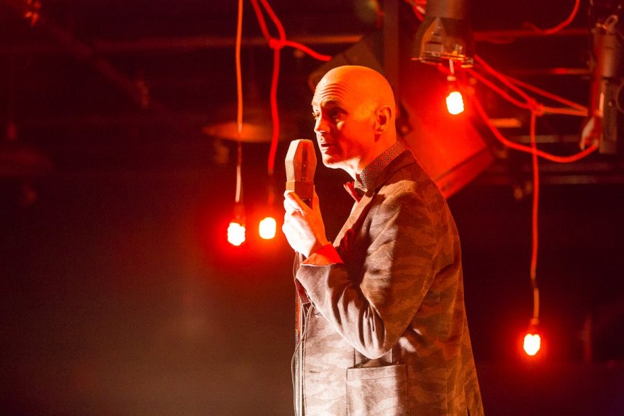 But unlike with a majority of his previous, deliberately linguistically-confounding plays, he’s not personally responsible for the version of A Chronicle of the Madness of Small Worlds currently running Next Door at New York Theatre Workshop through February 11. Instead, Elena Araoz adapted from his collection of the same name two original short stories — one in each act, both delivered as monologues underscored by sonically-distinct music courtesy of a live band surrounding the small, elevated stage, nicely complementing his bizarro fictional worlds (which suffer from the same problems as our own, a staple of quality sci-fi).