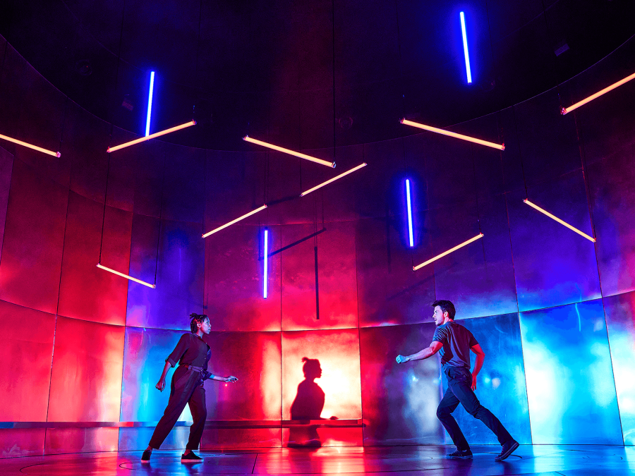 Rest assured, she’s no one-trick auteur pony (though, this affectation’s similarity to J.J. Abrams’ “signature” lens flare makes me giggle). Given her predilection for loud theatrical flourishes that are so noticeably in your face that they basically demand to be reckoned with, the reoccurrence of neon fluorescent lights across three of her recent revivals — Angels in America, Company, and now Cock in London — is a form of directorial editorialization that asks the audience to analyze their varied usages, in relation to both the specifics of the individual material AND the relative roles they serve from show to show.
