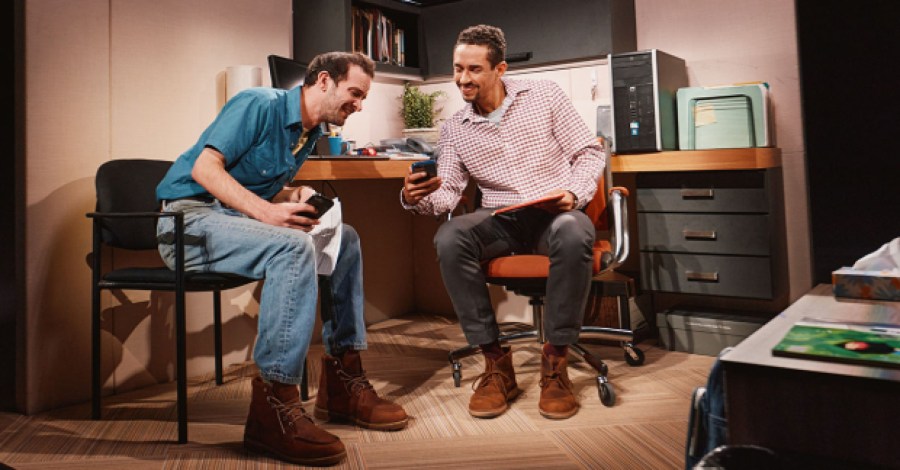 Though we hear all about the misery of their lives outside the cubicle (and, sometimes, inside of it), the focus is firmly on the burgeoning affinity between the gents. Refusing to explicitly depict anything outside this twosome feels like a commitment to a positive outlook; despite their tragedies raging beyond this office — which obviously inform what transpires within — the play stays locked on their blossoming friendship, and how they influence each other to better deal with the chaos brewing on the other side of that door.