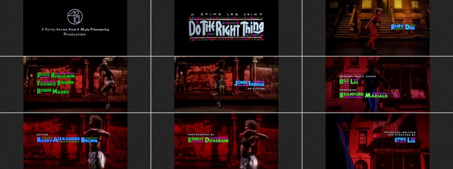 Though comparing the two might be sacrilege, both of their title sequences guide the audience’s attention towards their respective songs; Maybe I Do gives us nothing else to look at while listening besides the textual credits, and Do The Right Thing visually emphasizes the importance of the song by having Rosie Perez bust all the moves to it while facing the camera — there’s no onscreen stimuli to distract us except the song and her dance.
