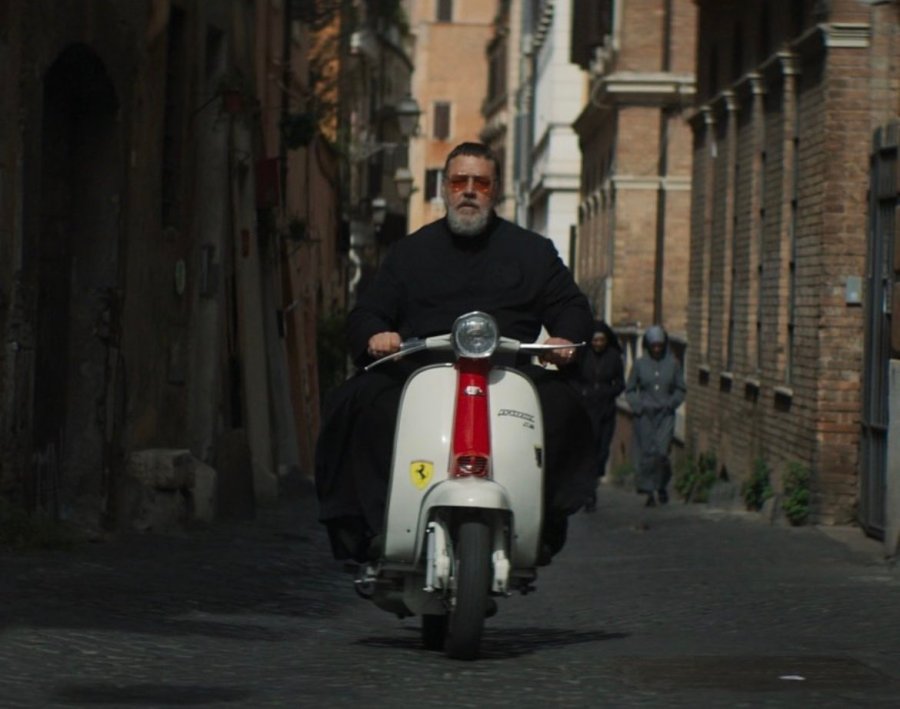 This franchise ambition makes sense (…somewhat?) of the movie’s attempts to establish iconography that audiences will lovingly associate with the series for installments to come (also, what’s When in Romer than papal iconography?). How many random shots are there of Russell Crowe — bedecked head-to-toe in his Johnny Cash Man-in-All-Black fatherly robes — cruising around Italy on his sweet little moped? It’s reminiscent of Wick walking down neon-drenched alleys with his dog, or even the OG Exorcist standing under the illuminated streetlight in front of those Georgetown steps.