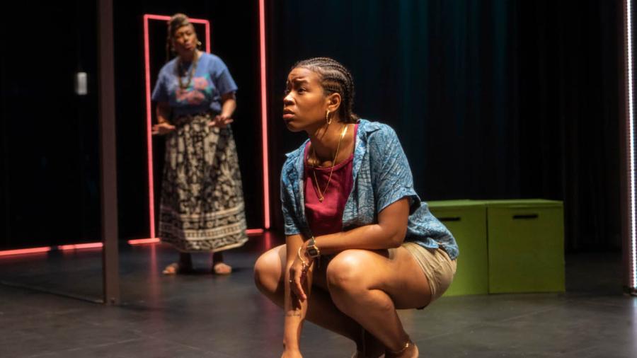 And the New Group’s off-Broadway production of Bernarda’s Daughters shows that you don’t need a camera to achieve this effect. Too many plays are set inside houses, yet their walls are almost always removed, offering the audience an unencumbered aperture. Bernarda’s Daughters, however, retains hints of its central home’s structure ON ALL SIDES, impeding vision no matter the seat location. We see the solid boards comprising the architectural bones of their casa, surrounded by a darkly translucent fabric, broken only by pane-less windows, all acting as constant barriers to our unfettered tableaus.